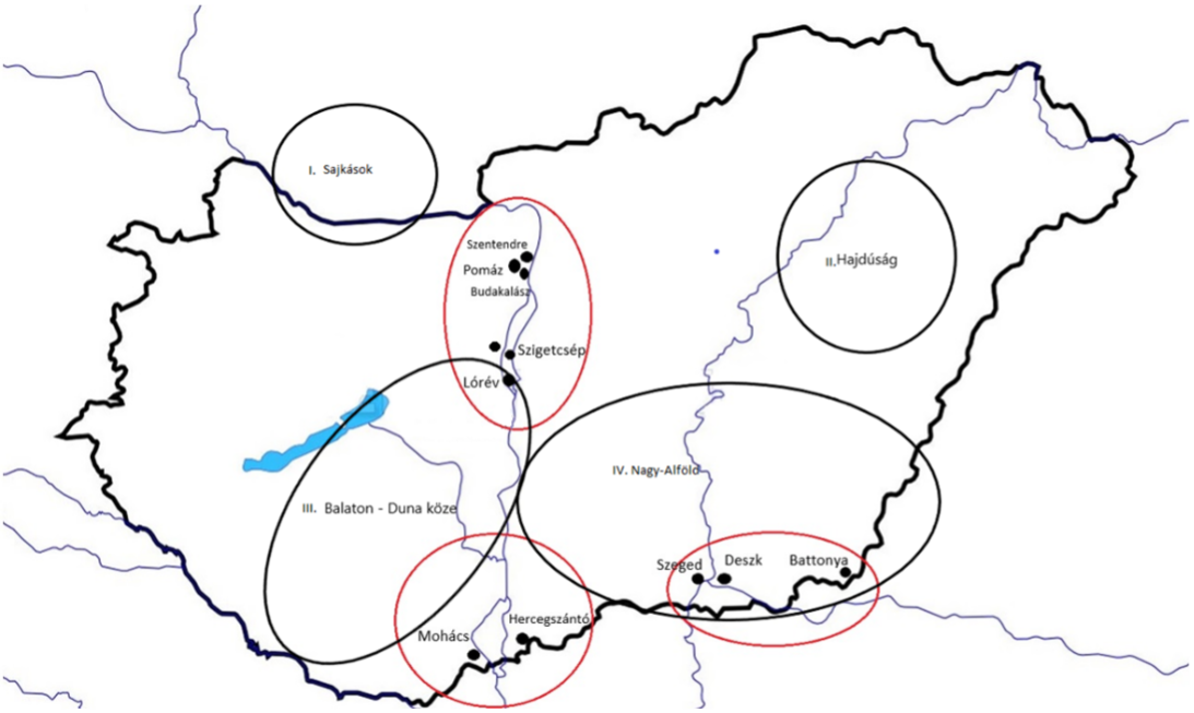 Карта бр. 3. Подручја насељена Србима. Историјска и данашња подручја на територији савремене Мађарске у којима се налазе насеља у којима су живели / живе (и) Срби. Црном бојом су заокружене области у којима је током историје било змачајно српско присуство, међутим у њима данас више нема традиционалних српских заједница. I: Делови насеља у којима су између XVI и почетка XVIII века живели српски шајкаши и трговци уз Дунав и реку Вах (мађ. Ваг), нпр. Ђур, Коморан. II: У области око Дебрецина која се зове Хајдушаг (по тзв. „хајдуцима“ – пандурима) Срби су живели углавном у XV – XVII веку, пре него што су се асимиловали. III: На Задунављу, на подручју омеђеном линијама Дунава и Балатона, за време отоманске владавине Срби живе компактно насељени од друге половине XVI века до Ракоцијеве буне (1703–1711). IV: У регији Велике низије, чак и у њеном централном делу, од прве половине XVII века до прве половине XVIII разасуто налазимо насеља у којима живе (и) Срби.