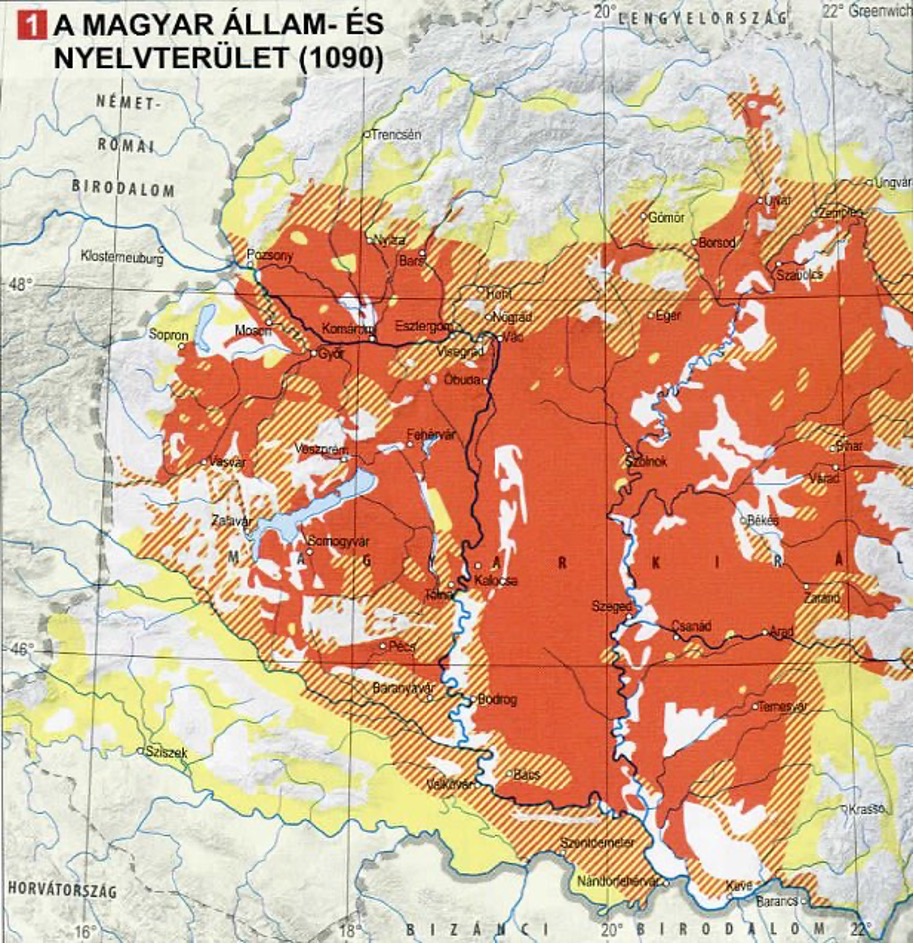 Карта бр. 1. Словенско језичко подручје у западноој и средњој Угарској крајем XI века (детаљ карте). Жутим је означено словенско језичко подручје, а шатирано мешовити словенско-мађарско. (Kocsis Károly et al: Magyarország nemzeti atlasza : Állam és nemzet, HUN-REN Magyar Kutatási Hálózat, Budapest, 86.р)