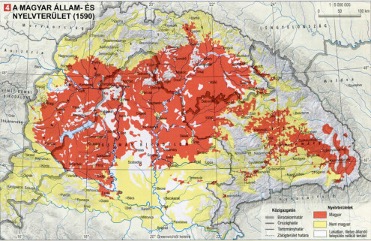 Карта бр. 2. Етничка подручја у Угарској 1590. године, према истраживањима мађарских историчара. Црвеним означена подручја у којима већину становништва чине Мађари, а жутим су означена подручја у којима већину становништва чине немађари. Белом и сивом бојом означена ненасељена, пуста подручја. У Банату, Бачкој и Срему доминира српско становништво. (Kocsis Károly et al: Magyarország nemzeti atlasza : Állam és nemzet, HUN-REN Magyar Kutatási Hálózat, Budapest, 87.р)
