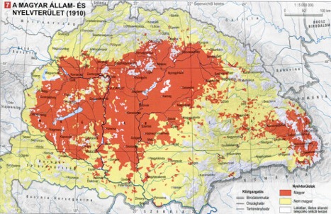 Карта бр. 6. Етничка карта Краљевине Угарске са почетка ХХ века, према подацима мађарских научника. Црвеном бојом су означена подручја у којима већину становништва чине особе са мађарским матерњим језиком. У подручју Баната већину спрам Мађара имају Срби, Румуни и Немци, у делу Бачке и Барање Срби, Шокци (Хрвати), Буњевци и Немци. (Kocsis Károly et al: Magyarország nemzeti atlasza : Állam és nemzet, HUN-REN Magyar Kutatási Hálózat, Budapest, 89.р)
