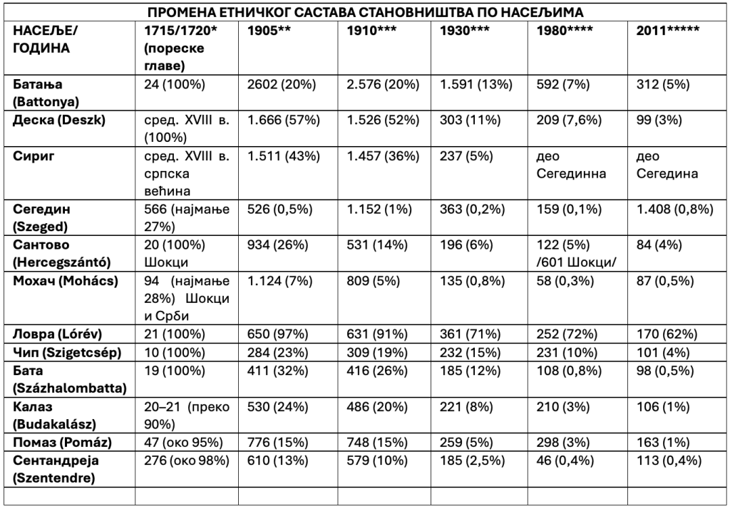 Мање од пола милиона Срба у Краљевини Угарској сконцентрисаних у јужним пределима престају да буду истакнути фактор у политичком и економском животу земље, постају демографски потиснути у градским срединама на територији данашње Војводине, а у централним деловима Мађарске претварају се у класичну дијаспору и националну мањину. На територији која одговара данашњој Мађарској, свега у четири села чине Срби већину (у Дески код Сегедина сасвим танку апсолутну; у малој Ловри на Чепељском острву скоро чисту; у барањском селу Шароку обичну; а у Новом Светом Ивану / Новом Сентивану релативну), док у осталим местима Срби чине мањину од 10–30%, поред доминантних Немаца или Мађара. У славној Сентандреји у којој су Срби дуго доминирали, почетком ХХ века живи свега 15% Срба.