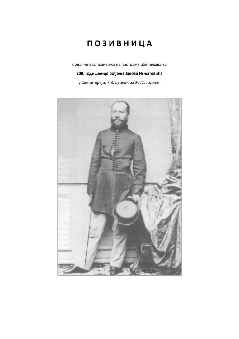 СВЕЧАНА ПОЗИВНИЦА ОБЕЛЕЖАВАЊЕ 200. ГОДИШЊИЦЕ РОЂЕЊА ЈАКОВА ИГЊАТОВИЋА