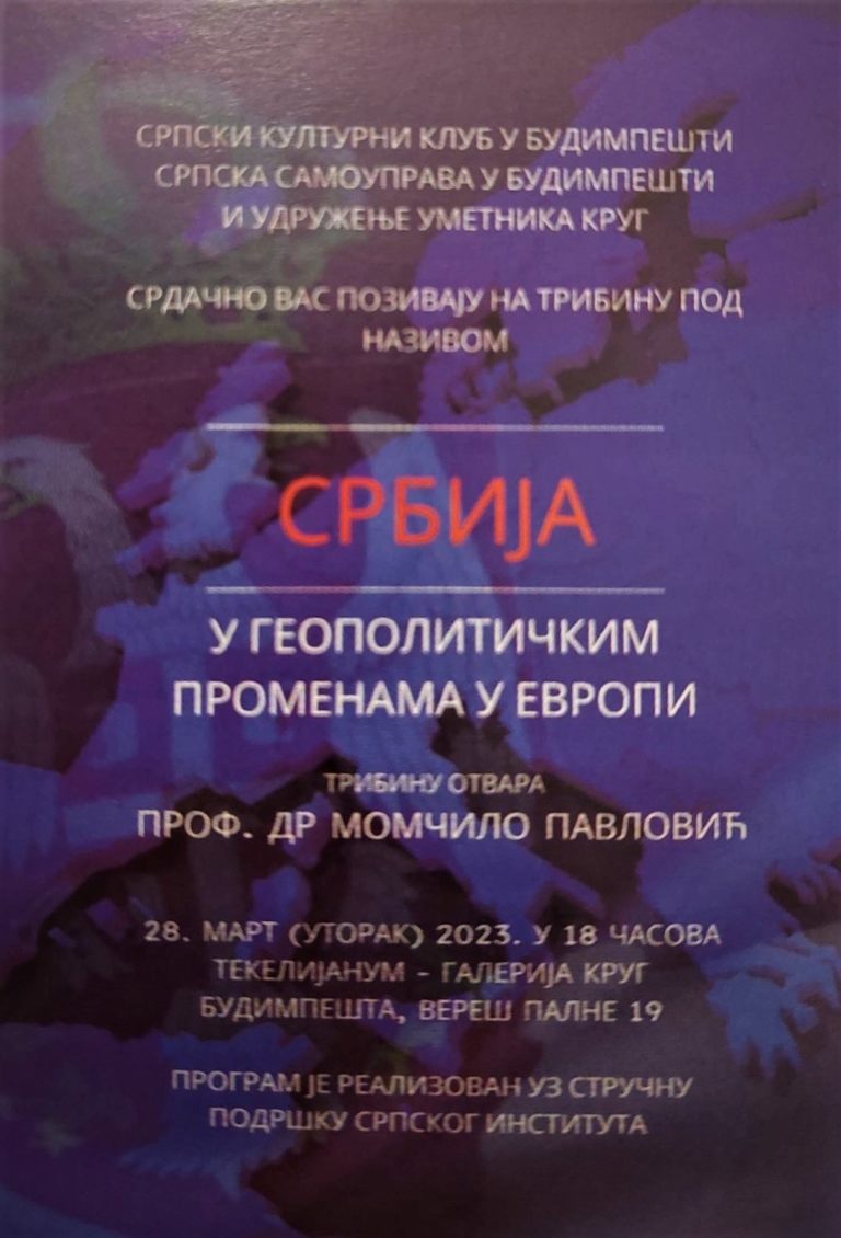 СРПСКИ КЛУБ У БУДИМПЕШТИСРПСКА САМОУПРАВА У БУДИМПЕШТИИ УДРУЖЕЊЕ УМЕТНИКА КРУГ СРДАЧНО ВАС ПОЗИВАЈУ НА ТРИБИНУ ПОД НАЗИВОМ СРБИЈАУ ГЕОПОЛИТИЧКИМ ПРОМЕНАМА ...
